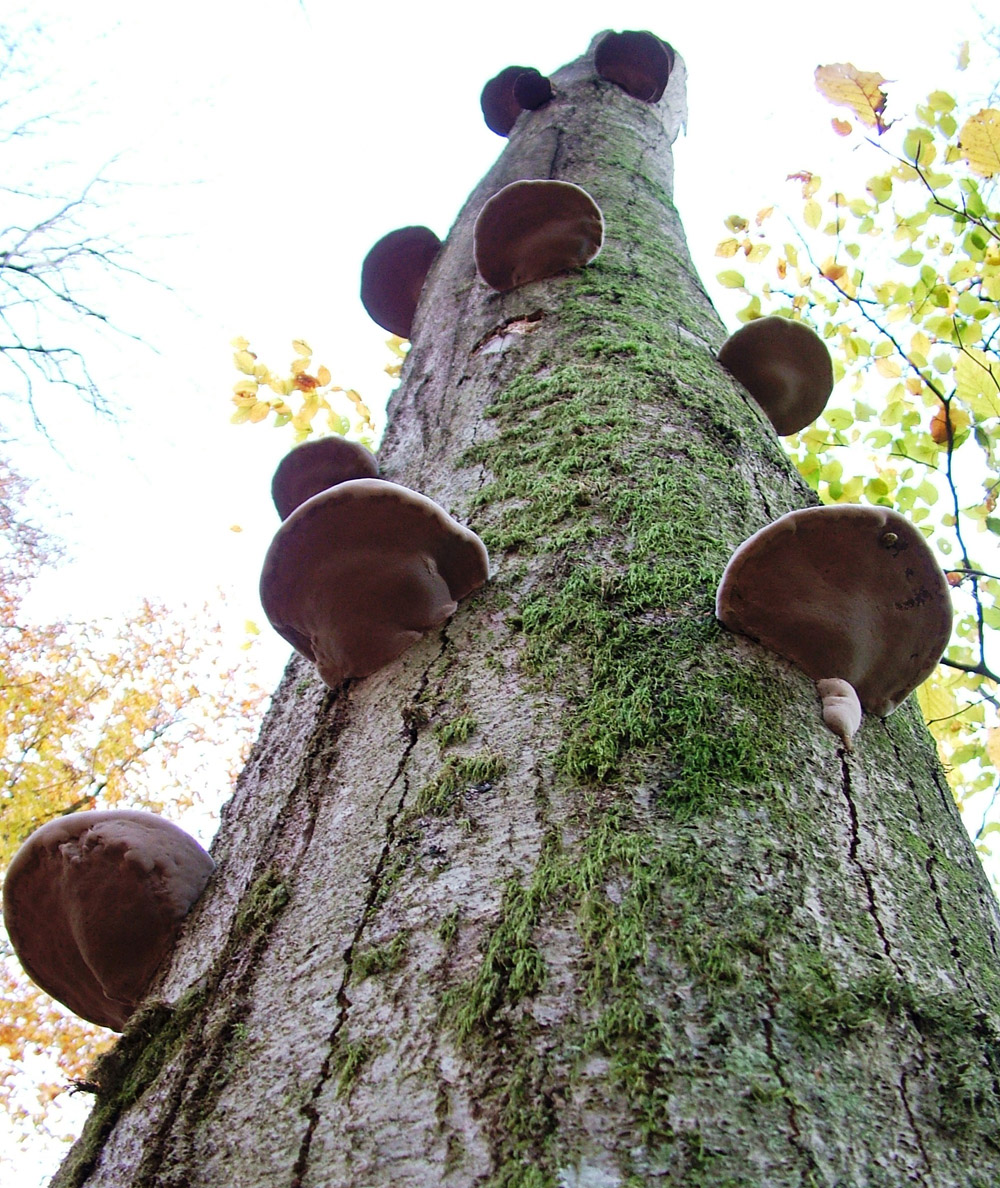 Fomes fomentarius Mårås Fnöskticka är parasit som bildar fruktkroppar på levande bokar längs med hela stammen. De är fleråriga, hovlika och kraftigt fårade och växer ofta ihop till samlingar eller rader. Fnösktickan kan fortleva ytterligare några år på boken som saprofyt efter att trädet dött. Foto: Semir Maslo, 25 okt -08 |