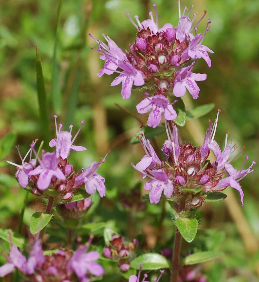 Thymus serpyllum - Backtimjan Biskopstorps NR Knaggared. Bladen hos backtimjan är försedda med hår (se bild). Arten är ursprunglig. Den ljuskrävande betes- och allmänt kulturgynnade arten växer mattbildande på torr mark. |
