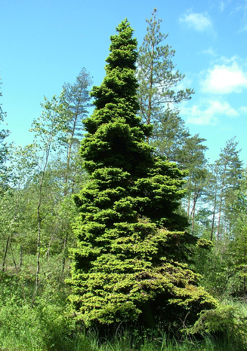 Ovanlig gran (Picea abies) Norra Remma I ett kärrområde som ligger alldeles i närheten växer några ovanliga träd. Förutom några gamla tallar (uppskattas vara ca 300 år gamla) hittar man ett väldigt egendomligt exemplar av gran. Exemplaret har tydligen muterat av någon anledning. De basala grenarna ser helt normala ut, medan resten av trädet har betydligt tätare och mindre barr. Foto: Semir Maslo, 14 juni -09 |