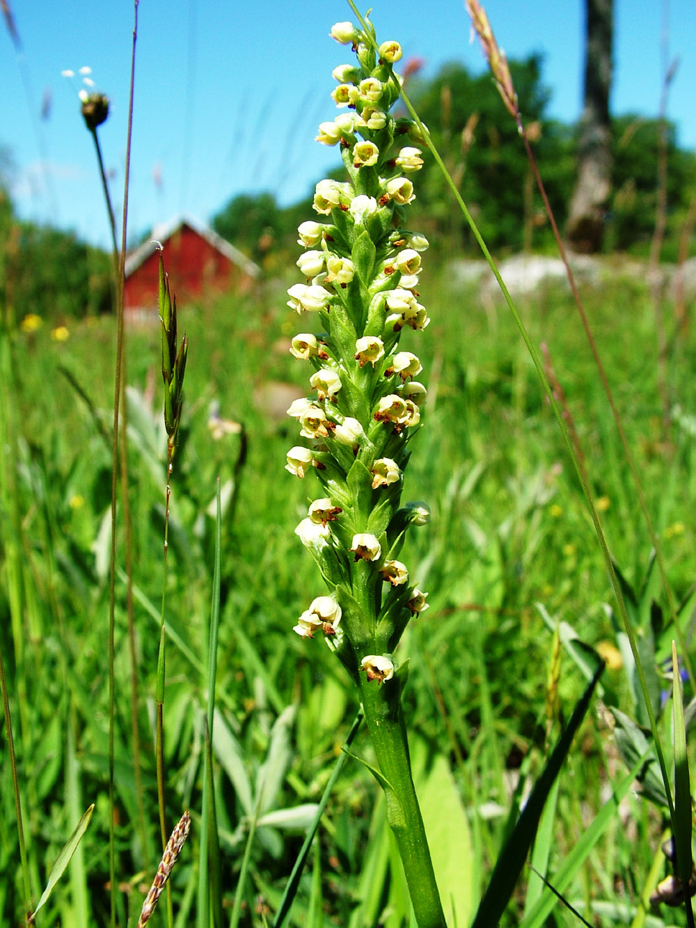 Pseudorchis albida - Vityxne Bild från Norra Remma. Alldeles i närheten ligger en stenig blandskog med inslag av bok. Här, i klippspringor hittar man några tuvor av sällsynta gaffelbräken. Vi avslutade vandringen i ett närbeläget kärrområde med några intressanta träd. Här hittar man några ex av ståtliga, gamla tallar samt ett väldigt märkligt exemplar av gran. Foto: Semir Maslo, 14 juni -09 |