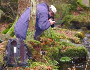Den ljusgröna tuvan i vattenkanten är skirmossa som just dokumenteras av Stefan Lindal. Arten tillhör en mossfamilj, Hookeriace, med en vid utbredning i tropikerna men endast denna representant når till Sverige. Gillar översilning, vattnets ph-värde ligger oftast inom intervallet 6-7. Arten är rödlistad och är Hallands landskapsmossa. Följearter: dunmossa, skuggmossa, flikbålmossa, m.fl. källvattenkrävande arter. Foto Jesper Lind, Trollabäcken den 19/11 2006. |